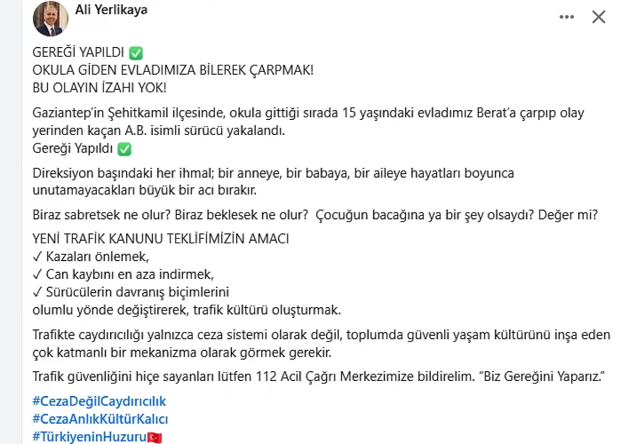 GEREĞİ YAPILDI ✅ OKULA GİDEN EVLADIMIZA BİLEREK ÇARPMAK! BU OLAYIN İZAHI YOK! Gaziantep'in Şehitkamil ilçesinde, okula gittiği sırada 15 yaşındaki evladımız Berat'a çarpıp olay yerinden kaçan A.B. isimli sürücü yakalandı. Gereği Yapıldı