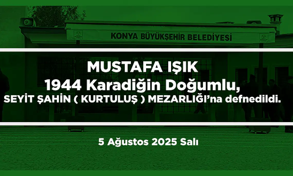 Haberler Vefat Edenler Konya'da Bugün 17 Kişi Toprağa Verildi (05 Ağustos 2025) Konya'da Bugün 17 Kişi Toprağa Verildi (05 Ağustos 2025) 05 Ağustos 2025 tarihinde Konya'da 17 kişi ebediyete uğurlandı. İşte vefat edenlerin isimleri, doğum yerleri ve defnedildikleri mezarlıklar. konyada ölenler PAYLAŞ 05.08.2025 18:35 Güncelleme: 05.08.2025 18:35 Rasyonel HaberEditör TAKİP ET 10 28 PAYLAŞ MUSTAFA IŞIK 1944 Karadiğin Doğumlu, SEYİT ŞAHİN ( KURTULUŞ ) MEZARLIĞI’na defnedildi.