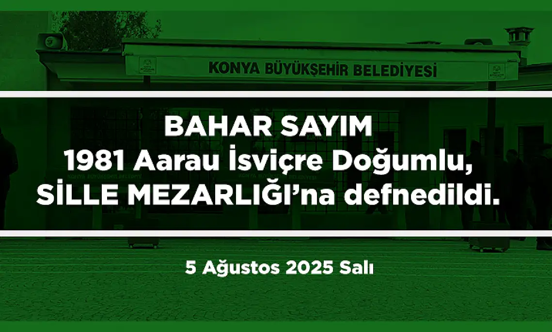 Haberler Vefat Edenler Konya'da Bugün 17 Kişi Toprağa Verildi (05 Ağustos 2025) Konya'da Bugün 17 Kişi Toprağa Verildi (05 Ağustos 2025) 05 Ağustos 2025 tarihinde Konya'da 17 kişi ebediyete uğurlandı. İşte vefat edenlerin isimleri, doğum yerleri ve defnedildikleri mezarlıklar. konyada ölenler PAYLAŞ 05.08.2025 18:35 Güncelleme: 05.08.2025 18:35 Rasyonel HaberEditör TAKİP ET 21 28 PAYLAŞ BAHAR SAYIM 1981 Aarau İsviçre Doğumlu, SİLLE MEZARLIĞI’na defnedildi.