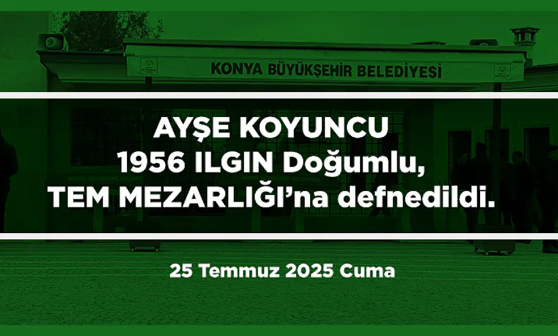 Haberler Konya Konya'da Bugün 17 Kişi Toprağa Verildi (25 Temmuz 2025 Cuma) Konya'da Bugün 17 Kişi Toprağa Verildi (25 Temmuz 2025 Cuma) 25 Temmuz 2025 tarihinde Konya'da 17 kişi ebediyete uğurlandı. İşte vefat edenlerin isimleri, doğum yerleri ve defnedildikleri mezarlıklar. konyada bugün ölenler PAYLAŞ 25.07.2025 17:27 Güncelleme: 25.07.2025 17:27 TAKİP ET 18 26 PAYLAŞ AYŞE KOYUNCU 1956 ILGIN Doğumlu, TEM MEZARLIĞI’na defnedildi.