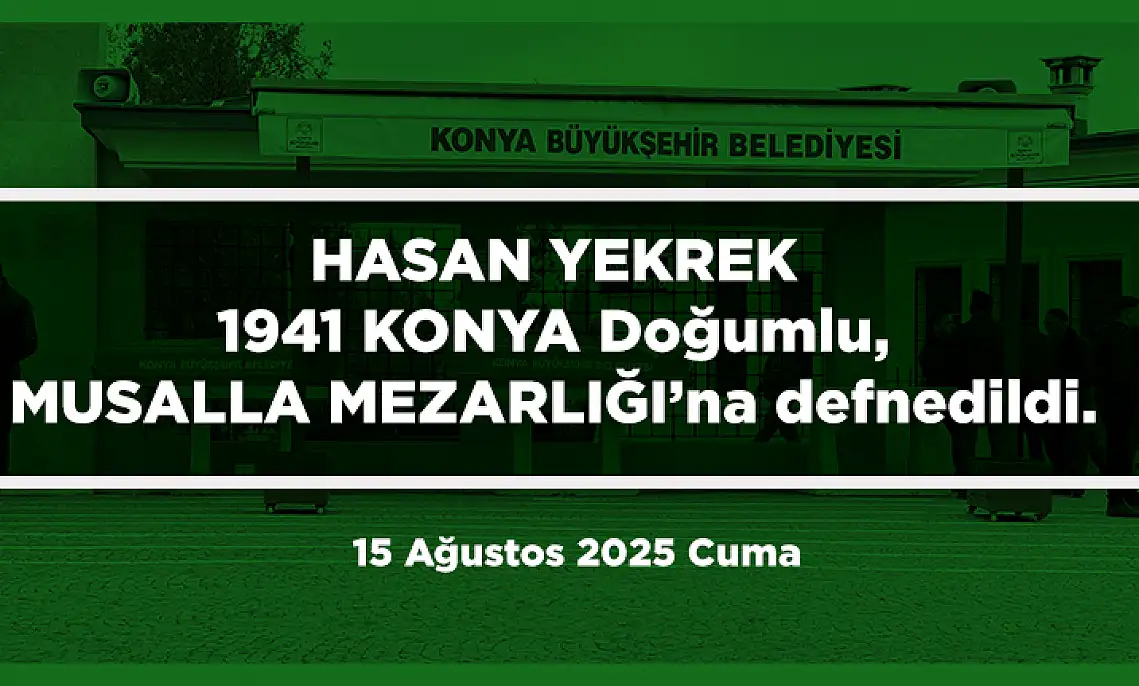 Haberler Vefat Edenler Konya'da Bugün 21 Kişi Toprağa Verildi (15 Ağustos 2025) Konya'da Bugün 21 Kişi Toprağa Verildi (15 Ağustos 2025) 15 Ağustos 2025 tarihinde Konya'da 21 kişi ebediyete uğurlandı. İşte vefat edenlerin isimleri, doğum yerleri ve defnedildikleri mezarlıklar. konyada vefat edenler PAYLAŞ 15.08.2025 20:30 Güncelleme: 15.08.2025 20:30 Rasyonel HaberEditör TAKİP ET 12 21 PAYLAŞ HASAN YEKREK 1941 KONYA Doğumlu, MUSALLA MEZARLIĞI’na defnedildi.