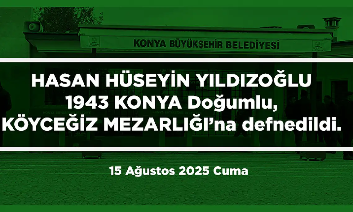 Haberler Vefat Edenler Konya'da Bugün 21 Kişi Toprağa Verildi (15 Ağustos 2025) Konya'da Bugün 21 Kişi Toprağa Verildi (15 Ağustos 2025) 15 Ağustos 2025 tarihinde Konya'da 21 kişi ebediyete uğurlandı. İşte vefat edenlerin isimleri, doğum yerleri ve defnedildikleri mezarlıklar. konyada vefat edenler PAYLAŞ 15.08.2025 20:30 Güncelleme: 15.08.2025 20:30 Rasyonel HaberEditör TAKİP ET 13 21 PAYLAŞ HASAN HÜSEYİN YILDIZOĞLU 1943 KONYA Doğumlu, KÖYCEĞİZ MEZARLIĞI’na defnedildi.