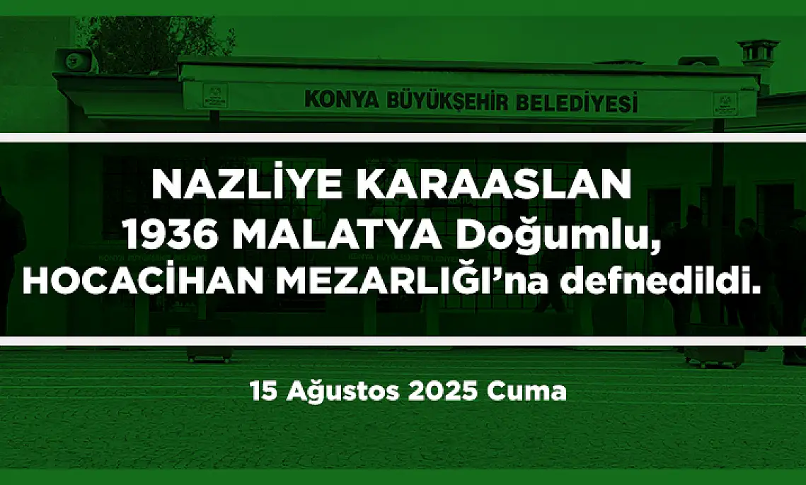 Haberler Vefat Edenler Konya'da Bugün 21 Kişi Toprağa Verildi (15 Ağustos 2025) Konya'da Bugün 21 Kişi Toprağa Verildi (15 Ağustos 2025) 15 Ağustos 2025 tarihinde Konya'da 21 kişi ebediyete uğurlandı. İşte vefat edenlerin isimleri, doğum yerleri ve defnedildikleri mezarlıklar. konyada vefat edenler PAYLAŞ 15.08.2025 20:30 Güncelleme: 15.08.2025 20:30 Rasyonel HaberEditör TAKİP ET 15 21 PAYLAŞ NAZLİYE KARAASLAN 1936 MALATYA Doğumlu, HOCACİHAN MEZARLIĞI’na defnedildi.