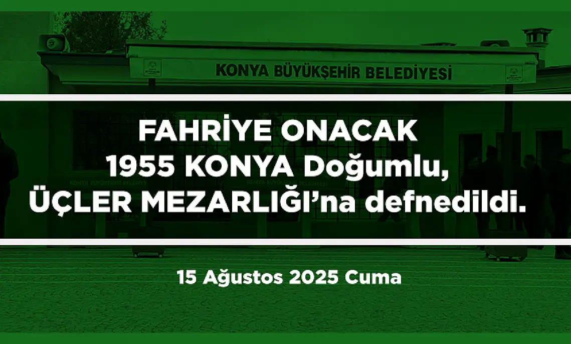 Haberler Vefat Edenler Konya'da Bugün 21 Kişi Toprağa Verildi (15 Ağustos 2025) Konya'da Bugün 21 Kişi Toprağa Verildi (15 Ağustos 2025) 15 Ağustos 2025 tarihinde Konya'da 21 kişi ebediyete uğurlandı. İşte vefat edenlerin isimleri, doğum yerleri ve defnedildikleri mezarlıklar. konyada vefat edenler PAYLAŞ 15.08.2025 20:30 Güncelleme: 15.08.2025 20:30 Rasyonel HaberEditör TAKİP ET 2 21 PAYLAŞ FAHRİYE ONACAK 1955 KONYA Doğumlu, ÜÇLER MEZARLIĞI’na defnedildi.