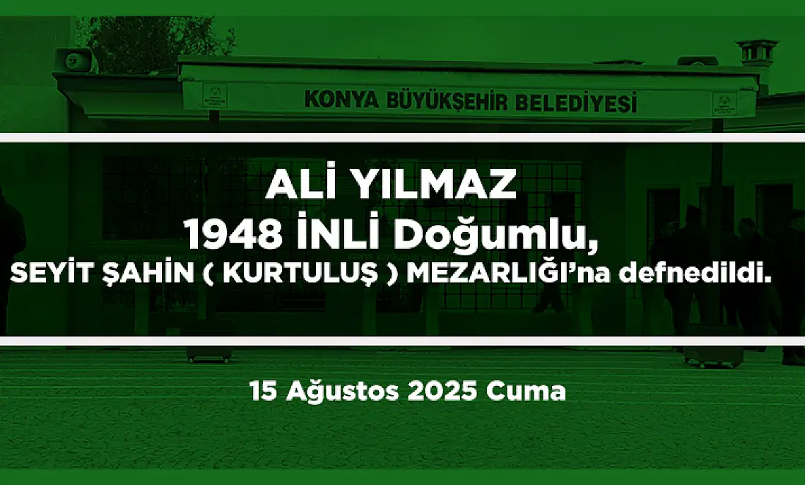 Haberler Vefat Edenler Konya'da Bugün 21 Kişi Toprağa Verildi (15 Ağustos 2025) Konya'da Bugün 21 Kişi Toprağa Verildi (15 Ağustos 2025) 15 Ağustos 2025 tarihinde Konya'da 21 kişi ebediyete uğurlandı. İşte vefat edenlerin isimleri, doğum yerleri ve defnedildikleri mezarlıklar. konyada vefat edenler PAYLAŞ 15.08.2025 20:30 Güncelleme: 15.08.2025 20:30 Rasyonel HaberEditör TAKİP ET 8 21 PAYLAŞ ALİ YILMAZ 1948 İNLİ Doğumlu, SEYİT ŞAHİN ( KURTULUŞ ) MEZARLIĞI’na defnedildi.