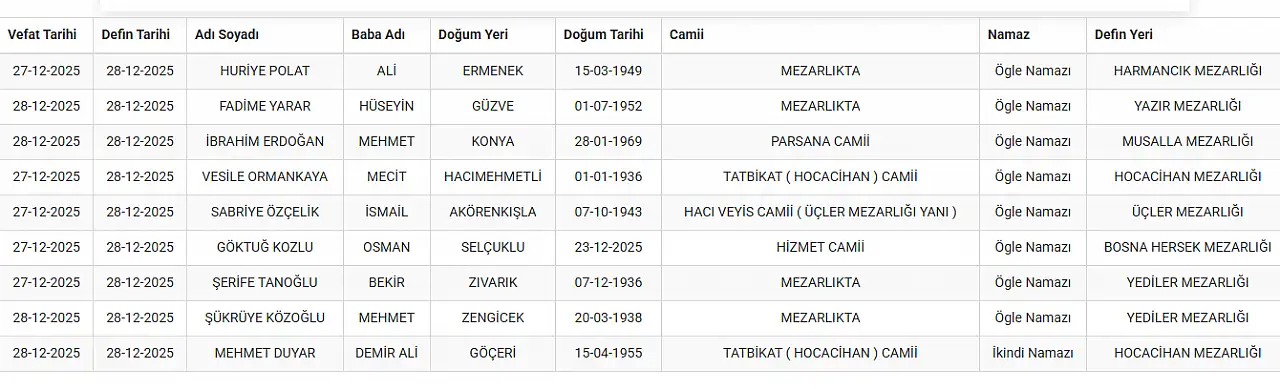 Haberler Genel KONYA'DA BUGÜN VEFAT EDENLER KONYA'DA BUGÜN VEFAT EDENLER KONYA'DA BUGÜN VEFAT EDENLER PAYLAŞ 28.12.2025 11:39 Güncelleme: 28.12.2025 12:19 Rasyonel HaberEditör TAKİP ET KONYA'DA BUGÜN VEFAT EDENLER