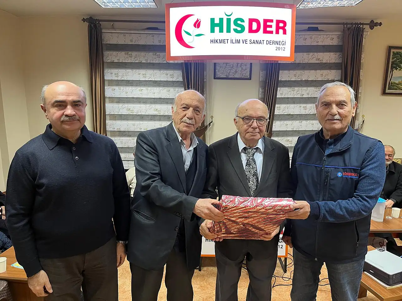 Sohbetin soru cevap kısmından sonra HİSDER Başkanı Prof. Dr. Önder KUTLU, Mehmet TATLI ve Talip TULUKCU tarafından Prof. Dr. Haşim KARPUZ ‘a derneğin hediyesi takdim edildi. Toplantı toplu fotoğraf çekimiyle sona erdi.