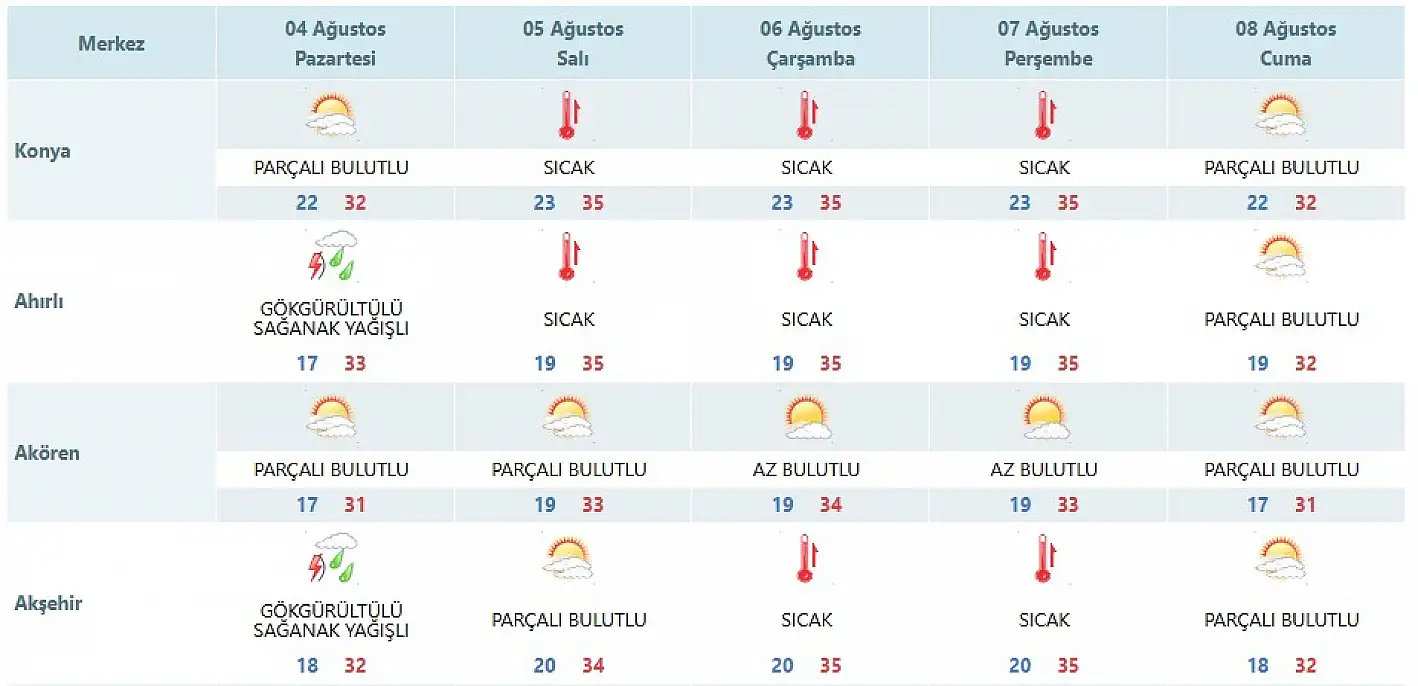 Haberler Konya Konya İçin Sağanak Uyarısı: 12 İlçede Pazartesi Günü Yağmur Bekleniyor! İşte Liste Konya İçin Sağanak Uyarısı: 12 İlçede Pazartesi Günü Yağmur Bekleniyor! İşte Liste Konya'da bir süredir devam eden sıcak havanın ardından, Meteoroloji Genel Müdürlüğü'nden serinleten bir haber ve önemli uyarılar geldi. Konya hava durumu PAYLAŞ 03.08.2025 19:07 Güncelleme: 03.08.2025 19:07 Rasyonel HaberEditör TAKİP ET 4 10 PAYLAŞ KONYA VE İLÇELERİ 5 GÜNLÜK HAVA DURUMU TAHMİNİ (4-8 AĞUSTOS 2025)