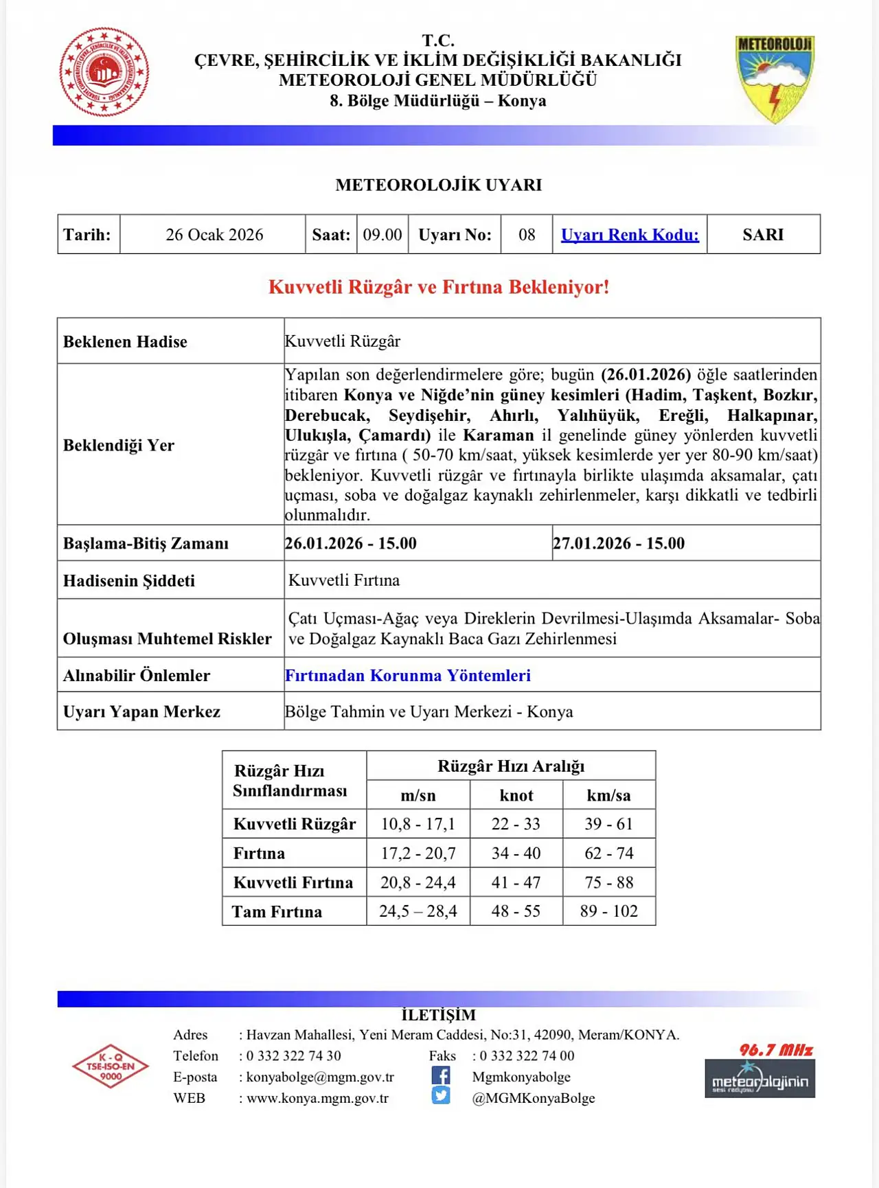 Konya’da etkili olması beklenen kuvvetli rüzgar ve fırtına nedeniyle çatı uçması, ağaç veya direklerin devrilmesi, ulaşımda aksamalar ile soba zehirlenmeleri gibi felaketlerin yaşanmaması adına bir duyuru yapılarak Konya ve çevresinde etkili olması beklenen fırtınaya karşı tedbir alınması için bilgi verildi
