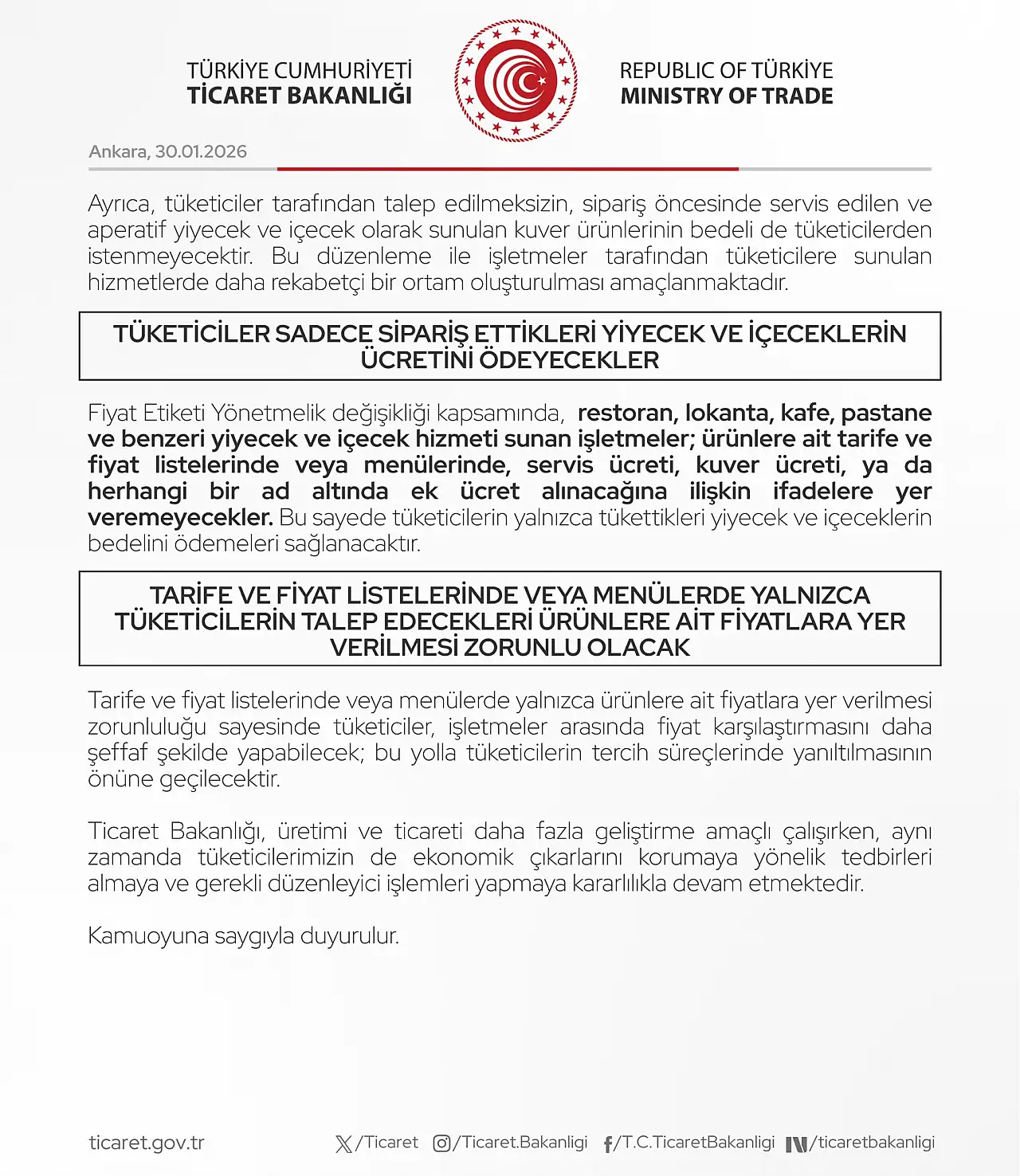 Ticaret Bakanlığı, Fiyat Etiketi Yönetmeliği'nde devrim niteliğinde bir değişikliğe gitti. Artık restoran, kafe ve pastane gibi işletmelerde, tüketiciden 'kuver' veya 'servis ücreti' adı altında ilave bedel alınması yasaklandı.